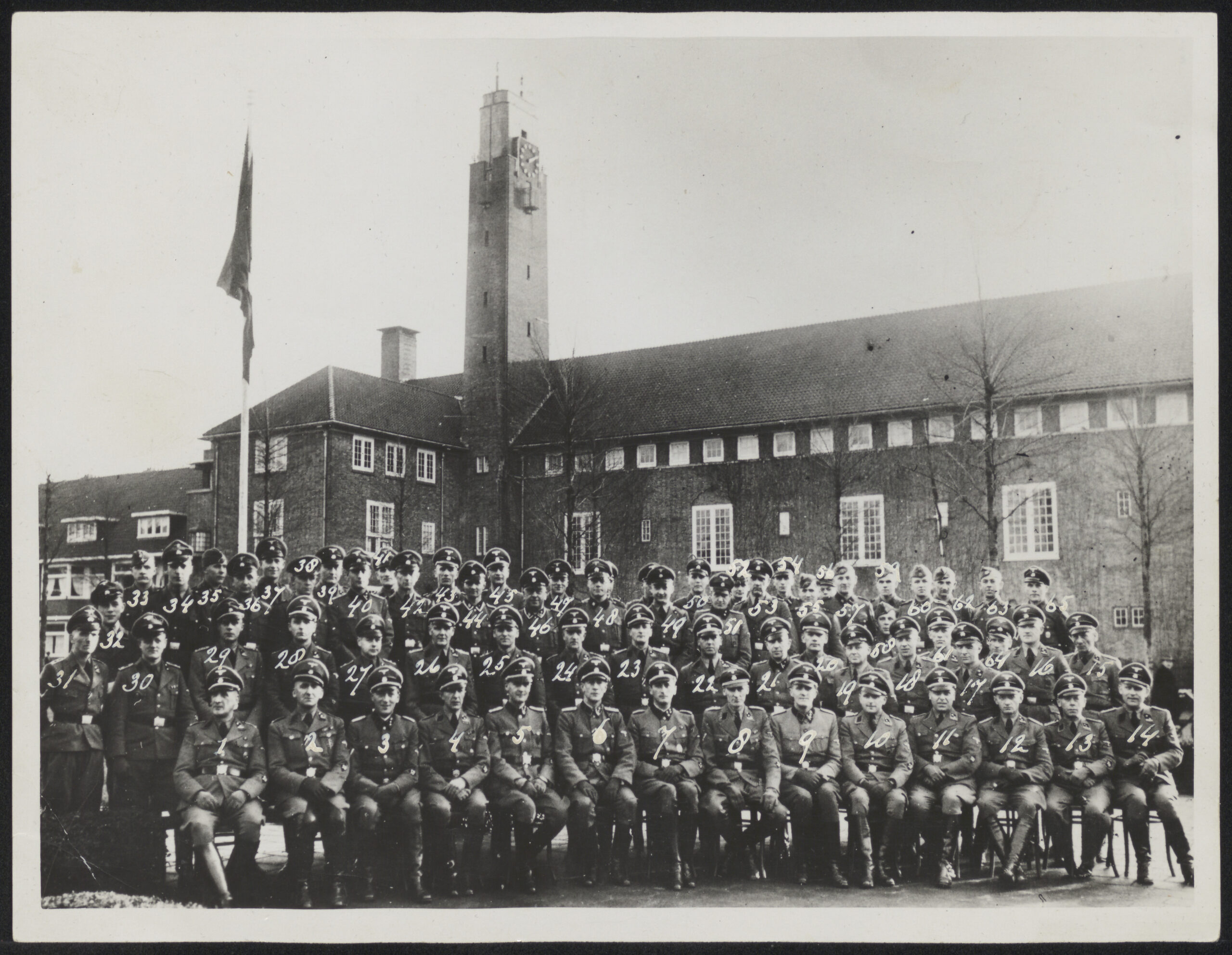 Sicherheitsdienst(SD) Amsterdam gevestigd in de Chr. Meisjes HBS, Euterpestraat. 1942- eind 1944. Bilderliste 1. Wilhelm Kaune, Wehrmachtsexekutive. 2. Kurt Döring, gearbeitet bei der Abt. IV A und IV B. 3. Rudolf Hassel gearbeitet bei der Abt. IV B. 4. Hauptsturmführer Streich, Zentralstelle für jüdische Auswanderer 5. Hauptsturmführer Karl Wörlein, Zentralstelle für jüdische Auswanderer 6. Hauptsturmführer Ferdinand aus der Fünten, Zentralstelle für jüdische Auswanderer 7. Sturmbannführer Willi Lages, Leiter der Aussendienst stelle Amsterdam. 8. Hauptsturmführer Hans Blumenthal, Leiter der Abt. III (SD) Amsterdam. 9. Obersturmführer und Kriminalkommissar Lütgenhus Leiter der Abt. IV in Amsterdam, spater nach Den Haag … Befehlshaber. 10. Obersturmführer Schunke, Abt. III (SD) Blumenthal. Vorname Herbert. 11. Untersturmführer Julius Frank, Verwaltungsbeamter Sicherheitpolizei Amsterdam. 12. Untersturmführer Hermann Neumeier, Leiter der Abt. Wehrmachtsexekutive in Amsterdam, zuletzt Leiter vom osten Utrecht und vor der Kapitulatin Aussenkommando Hilversum. 13. Untersturmführer Adolf Golder, Leiter von Abt. V Sicherheitspol. Amsterdam. 14. Otto Kempin, Abt. IV B 4 und zuletzt Spionageabt. 15. Untersturmführer Wilhelm Oligschlager, Ein und Ausreisestelle Amsterdam, dann IV A zuletzt Schutzhaftzentrale bei B.d.s. Den Haag. 16. Mathias Schmitz, Wehrmachtsexekutive zuletzt IV A. 17. Kretschmann, Abt. V bei Golder, Anfang 1944 nach Deutschland zurück. 18. Heinrich Franz, Kraftfahrer. 19. Fritz Fischer, Abt. IV A Arbeitseinsatz. 20. Gustav Grunert, Abt. Wehrmachtsexekutive. 21. Otto Häske, Abt. V Gelder 22. Johan Havenet, Wehrmachtsexekutive Amsterdam, zulets Kommando Utrecht und Hilversum. 23. Ernst Wehner, im März 1945 erschossen worden. 24. Arnold Albani, IV A dann IV B, Spionageabwehr und zuletzt Spionageabwehr. 25. Ernst Maibaum, Ein- und Ausreisestelle, dann IV B zuletzt Spionageabwehr. 26. Jakob Wachowiak, Spionageabwehr, dann Abt. IV B und zuletzt Abt. IV A. 27. Paul Brose, Schu Source: NIOD 76747